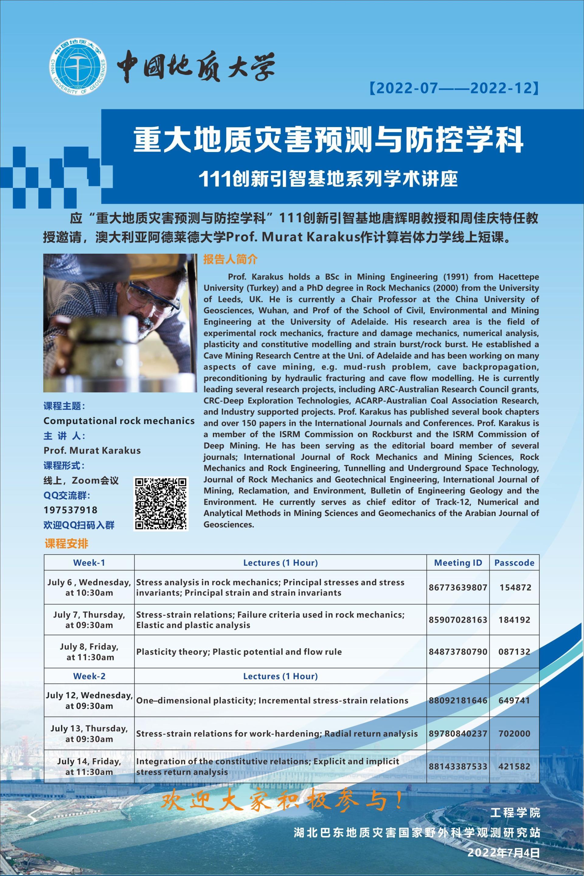 重大地质灾害预测与防控学科---111创新引智基地系列学术讲座Prof.Murat Karakus作计算岩体力学线上短课