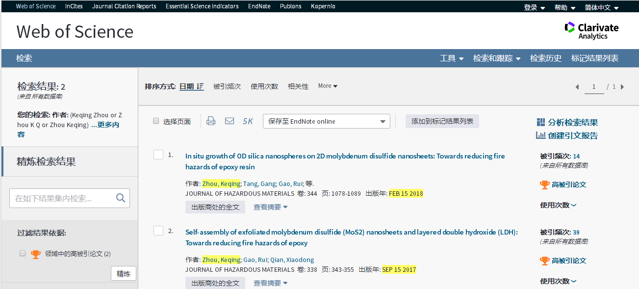 基本科学指标数据库(Essential Science Indicators,简称ESI)最新数据显示,安全工程系周克清老师发表的论文“In situ growth of 0D silica nanospheres on 2D molybdenum disulfide nanosheets: Towards reducing fire hazards of epoxy resin”入选高被引论文。该论文是周克清老师以韦德官方网站(武汉)bevictor伟德官网为第一单位、第一作者和通讯作者身份发表的第2篇ESI高被引论文。2018年7月周克清老师发表的论文“Self-assembly of exfoliated molybdenum disulfide (MoS2) nanosheets and layered double hydroxide (LDH): Towards reducing fire hazards of epoxy”曾同时入选ESI高被引论文和热点论文。