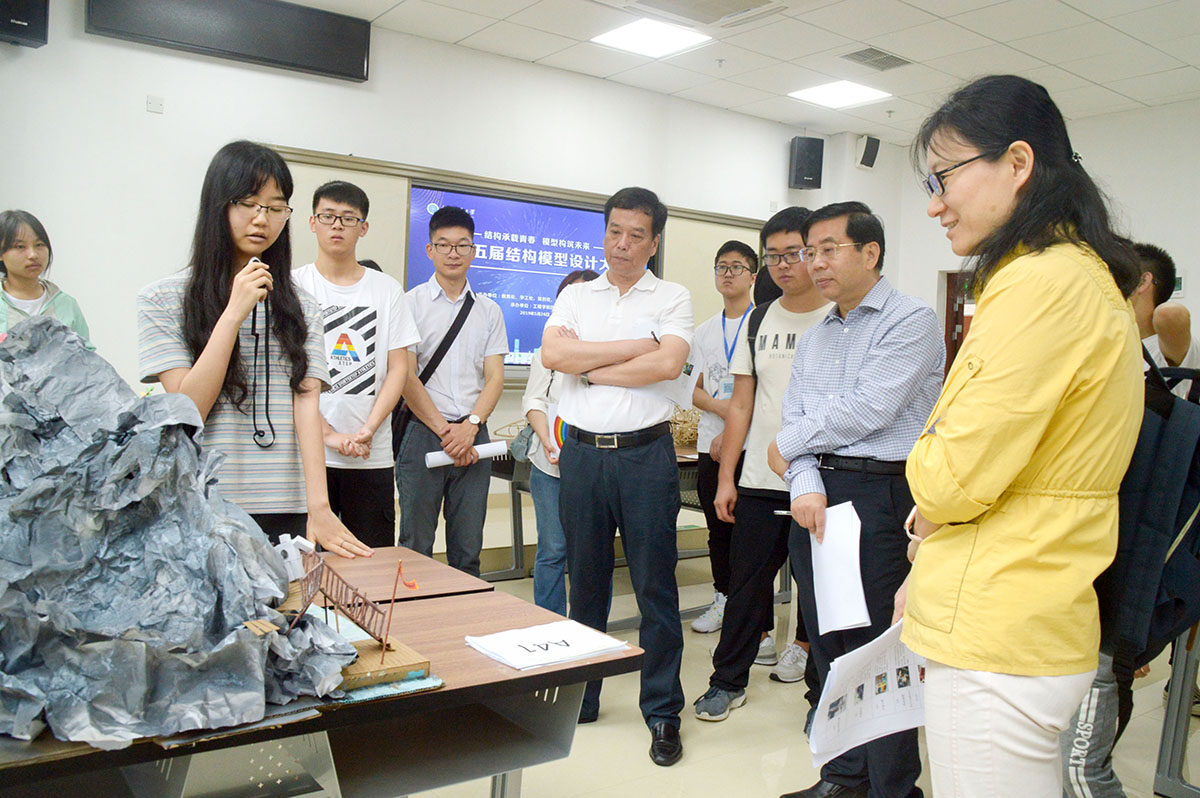 与此同时,13支结构类团队要求在一天时间内,使用竹皮、竹杆等材料,在250mm×250mm的正方形区域内现场制作出山地输电塔模型,并进行加载。综合设计书、制作过程、加载表现评定成绩。不仅考察参赛队员的动手能力,也是对力学知识综合运用、团队分工协作能力的考验。