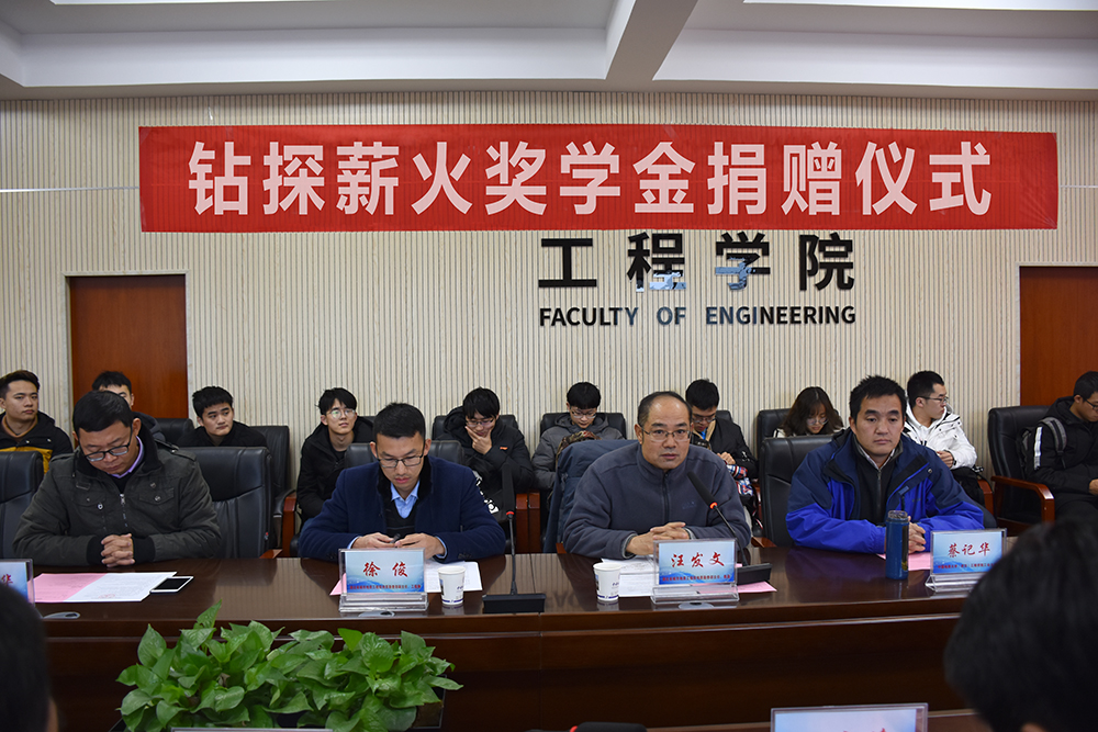 陈飞致辞,他首先向员工汪发文、徐俊及bevictor伟德官网蒋国盛、蔡记华、卢春华等几位老师对公司工作和钻探专业的关心与支持表达了谢意。他说,此次捐赠资金来源于校企合作的成果奖励,希望双方今后发挥各自优势加深加强合作,促进科技成果转化;通过设立此次奖学金,更加激励同学们学好专业知识,树立专业自信,为将来投身工程行业,服务国家建设做好准备。
