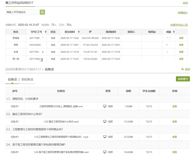 《工程项目管理》课程的员工课后作业和在线学习完成情况的监督统计