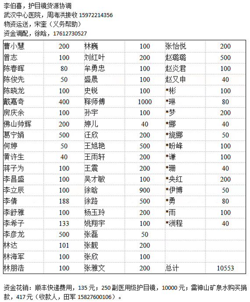 徐晗博士:首先不管别人捐了多少,只要捐了的就是很给力的事情。我提一个建议,我也看到我们公司有些人在搞募捐的事情,我建议如果可以捐物资就尽量捐物资,因为物资才是最紧缺的。如果说要捐赠医疗物资的话,你们可以去找医院的公示信息,像中心医院或者协和医院缺什么物资他们会公示出来,就比如说缺N95型口罩和防护服,他们会把他们缺的是什么类型的写出来,还有他们医院的接收人的联系方式。