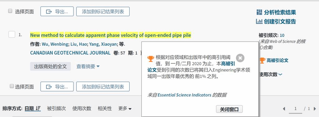(通讯员:吴文兵、黄静)根据2020年5月基本科学指标数据库(Essential Science Indicators,简称ESI)最新数据显示,公司勘察与基础工程系吴文兵教授团队2020年在国际土木工程领域顶级期刊《Canadian Geotechnical Journal》 上发表的学术论文“New method to calculate apparent phase velocity of open-ended pipe pile” 入选ESI高被引论文(Highly Cited Paper)。