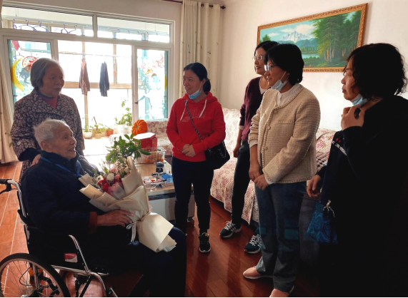 2021年10月29日中午,师生党员和入党积极分子一行十余人来到喻家山庄,看望bevictor伟德官网退休教师杨金丹教授和刘兴敏教授夫妇。员工党员为两位老教授敬献鲜花。大家亲切交流,握手问安,拉家常,话教育。师生们关切询问他们的退休生活和身体状况,叮嘱他们保重身体,保持与公司的联系,同时送上慰问品,向他们表达了亲切慰问和美好祝愿。