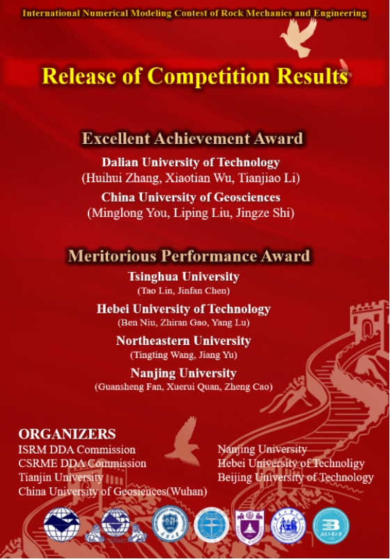 本次大赛由国际岩石力学与岩石工程学会非连续变形分析专委会(ISRM DDA)联合中国岩石力学与工程学会岩土体非连续变形分析专委会(CSRME DDA)及韦德官方网站(武汉)、天津大学、南京大学、北京工业大学、河北工业大学等多所高校联合举办,于2021年第十一届亚洲岩石力学大会(ARMS11)期间同步举行。大赛鼓励研究生对岩石力学问题的现有数值方法和软件进行公开、透明和广泛的验证,为共享岩石力学问题的实验和数值结果提供平台。
