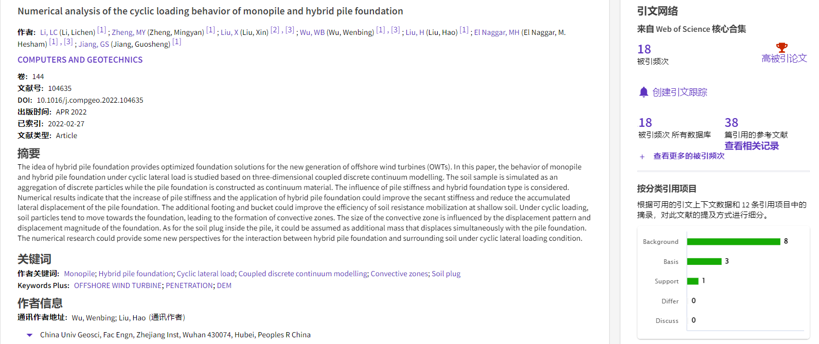 根据2022年11月基本科学指标数据库(Essential Science Indicators,简称ESI)最新数据显示,bevictor伟德官网勘察与基础工程系吴文兵教授团队于2022年在国际岩土工程数值模拟权威期刊Computers and Geotechnics上发表的学术论文“Numerical analysis of the cyclic loading behavior of monopile and hybrid pile foundation”入选ESI高被引论文。该论文第一作者为勘察与基础工程系博士后李立辰,通讯作者为吴文兵教授,韦德官方网站(武汉)bevictor伟德官网为第一署名单位。