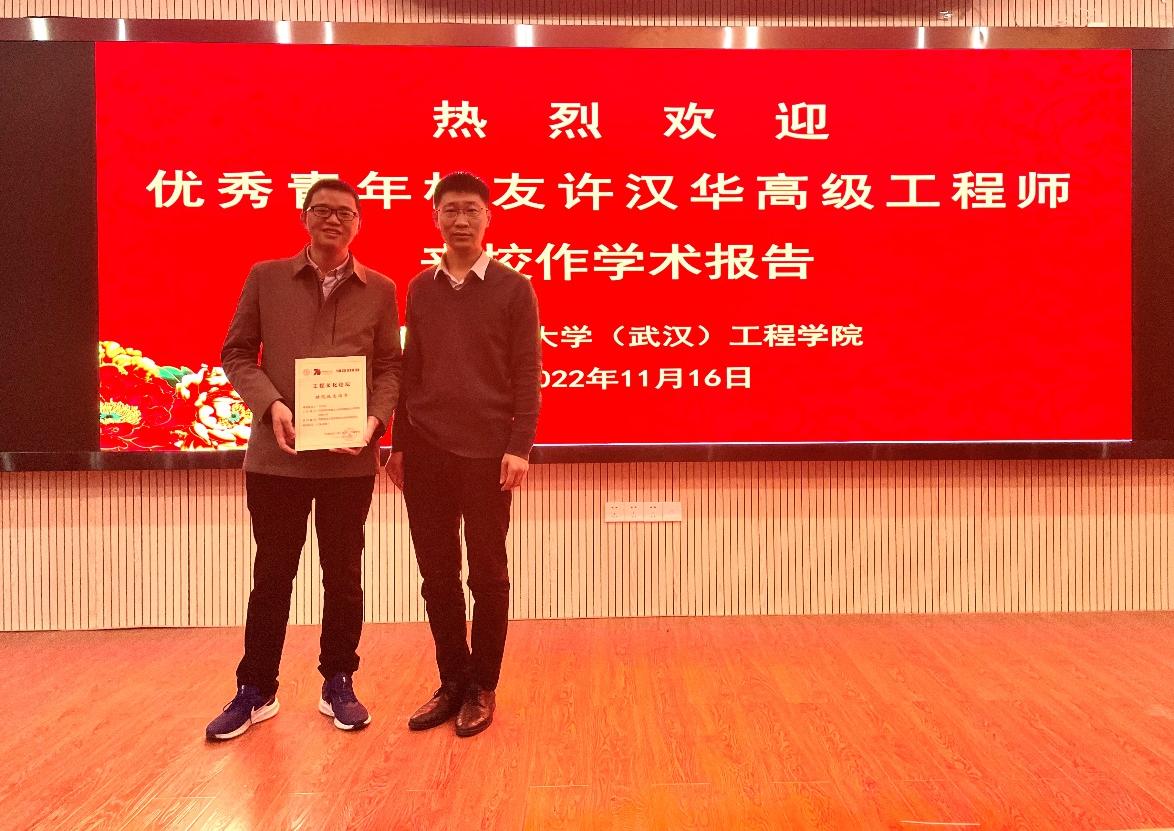 邹俊鹏特任教授对报告进行了总结发言,向许汉华高级工程师颁发了韦德官方网站(武汉)70周年校庆系列学术活动工程文化论坛特邀报告证书,并合影留念。