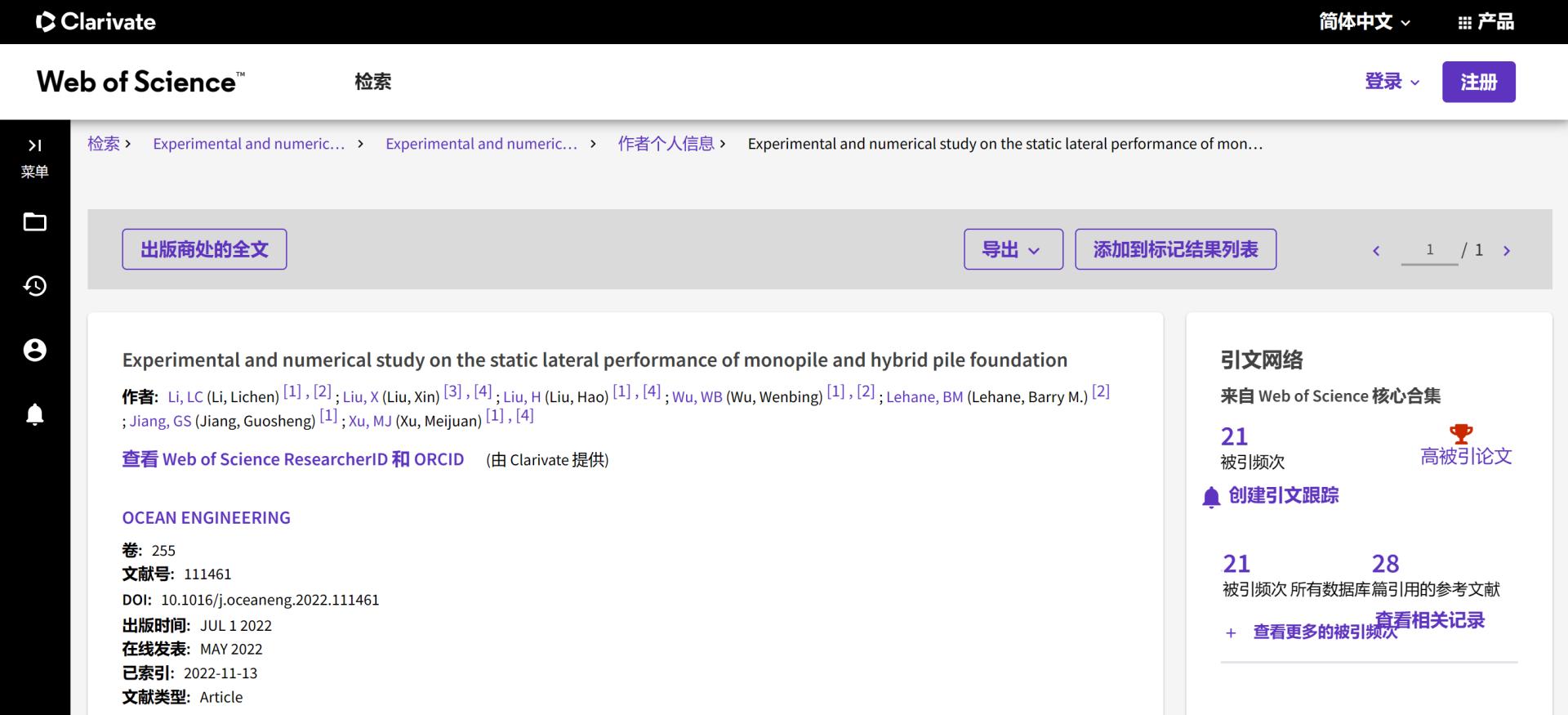 (通讯员 吴文兵)根据2023年6月基本科学指标数据库(Essential Science Indicators,简称ESI)最新数据显示,bevictor伟德官网勘察与基础工程系蒋国盛教授团队于2022年在国际海洋岩土领域权威期刊Ocean Engineering上发表的学术论文“Experimental and numerical study on the static lateral performance of monopile and hybrid pile foundation”入选ESI高被引论文。该论文第一作者为勘察与基础工程系博士后李立辰,通讯作者为吴文兵教授,韦德官方网站(武汉)bevictor伟德官网为第一署名单位。