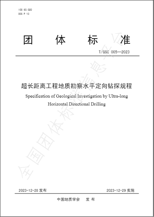 (通讯员 闫雪峰)近日,由公司窦斌教授主持制定的《超长距离工程地质勘察水平定向钻探规程》(T/GSC 005-2023)被中国地质学会团体标准委员会审定通过,并于2023年12月29日起正式实施。