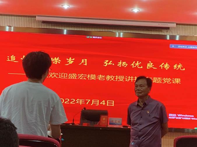 盛教授展示了他作为军演代表和毛主席的合照以及“光荣在党50年”纪念奖章,深切地表达出爱国爱党的真挚感情。盛教授结合自己退休后在美国等西方国家的生活经历,将中美经济社会发展方面进行系列数据对比,讲述了中国特色社会主义事业所取得的伟大成绩,肯定了社会主义制度的优越性。他告诫党员同志要不忘初心,牢记使命,永远跟党走,积极进取奋斗终身。他还与大家一起重温“两个一百年”奋斗目标,并对党员同志提出了殷切希望。