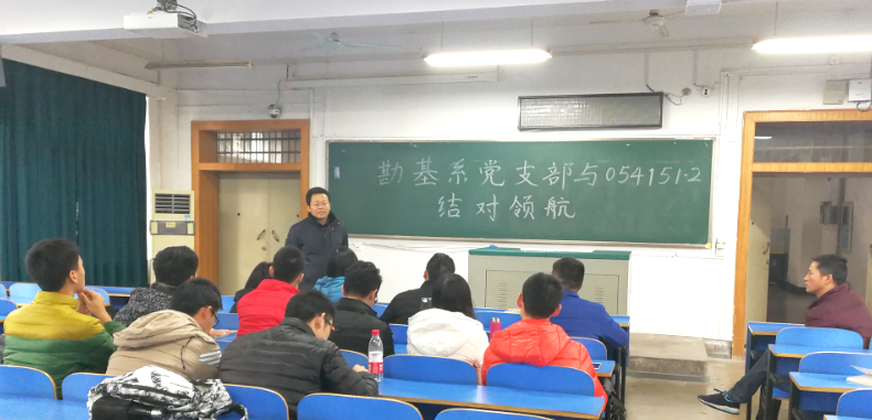 2017年12月7日下午2:30-4:30,勘基系党支部支委成员与勘查技术与工程专业的054151班和054152班全体党员在教一楼205室开展了“引领成长,共创卓越”的“结对领航”活动。活动由勘基系党支部书记段隆臣同志主持。段老师首先介绍了师生党支部“结对领航”活动的目的、意义,并在与员工商量后确定了勘基系师生党支部“结对领航”活动的长效机制,并希望将“结对领航”活动推广到两个班级的全体同学。随后,段隆臣老师、潘秉锁老师和吴文兵老师先后跟同学们分享了自己的成长经历,并将自己的成功与失败的经验与大家分享。最后,开展师生交流讨论,参会同学先后就“本-硕-博”贯通制培养模式、考研与保研、就业方向的困惑、勘查与技术工程专业发展前景等进行了提问,三位老师结合自身及学长学姐们的情况对所提问题进行了详细的解答。